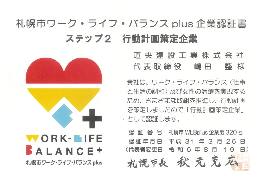 ワーク・ライフ・バランス plus行動計画策定企業としてステップ2に認証されました。